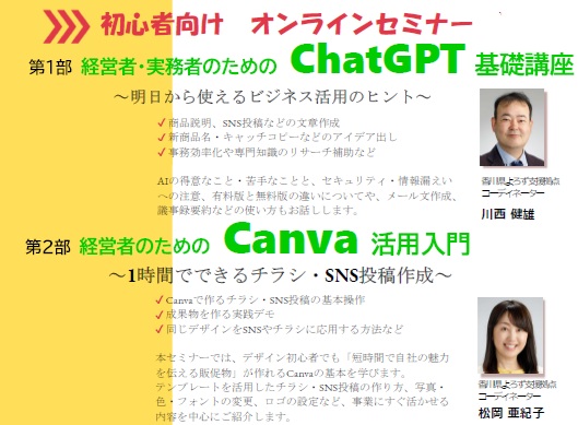 全てのお知らせ(お知らせ)第13回 たどつ創業セミナー(募集中)のお知らせ 2025.11.6 / お知らせ(お知らせ)【2025/11/22催】離島移住 ✕ 起業・開業・フリーランス オンライン相談会 2025.10.27 / お知らせ(お知らせ)【新着動画】経営判断 番外編 2025.10.22 / お知らせ(お知らせ)よろず支援拠点セミナー募集中のお知らせ 2025.10.16 / お知らせ(お知らせ)実践で学ぶ!ターゲット別「売れる販促」作成セミナー(募集中)のお知らせ 2025.10.14 / お知らせ(お知らせ)店舗型サービス業向け 創業セミナー(募集中)のお知らせ 2025.10.14 / お知らせ(お知らせ)よろず支援拠点セミナー募集中のお知らせ 2025.10.10 / お知らせ(お知らせ)【新着動画】お金の借り方と安定経営に必要なスキル 2025.10.6 / お知らせ(お知らせ)【新着動画】SNS何をどうすればよいの? 2025.10.6 / お知らせ(お知らせ)【新着動画】コーディネーターから見た香川県よろず支援拠点 2025.10.6 / お知らせ(お知らせ)【新着動画】経営判断のチェックポイント 2025.10.1 / お知らせ(お知らせ)【新着動画】廃業・破産 事業をやめるとは どういうことか? 2025.10.1 / お知らせ(お知らせ)【2025/10/11催】離島移住 ✕ 起業・開業・フリーランス オンライン相談会 2025.9.29 / お知らせ(お知らせ)よろず支援拠点セミナー募集中のお知らせ 2025.9.26 / お知らせ(お知らせ)「人手不足時代を乗り切る採用と定着の実現するセミナー」のお知らせ 2025.9.12 / お知らせ(お知らせ)助成金で始めるリスキリング戦略セミナーのお知らせ 2025.9.8 / お知らせ(お知らせ)よろず支援拠点セミナー募集中のお知らせ 2025.9.2 / お知らせ(お知らせ)よろず支援拠点セミナー募集中のお知らせ 2025.8.28 / お知らせ(お知らせ)【2025/9/20開催】離島移住 ✕ 起業・開業・フリーランス オンライン相談会 2025.8.26 / お知らせ(お知らせ)よろず支援拠点セミナー募集中のお知らせ 2025.8.22 / お知らせ(お知らせ)よろず支援拠点セミナー募集中のお知らせ 2025.8.6 / お知らせ(お知らせ)よろず支援拠点セミナー募集中のお知らせ 2025.8.5 / お知らせ(お知らせ)よろず支援拠点セミナー募集中のお知らせ 2025.8.1 / お知らせ(お知らせ)よろず支援拠点セミナー募集中のお知らせ 2025.8.1 / お知らせ(お知らせ)よろず支援拠点セミナー募集中のお知らせ 2025.8.1 / お知らせ(お知らせ)よろず支援拠点セミナー募集中のお知らせ 2025.8.1 / お知らせ(お知らせ)よろず支援拠点セミナー募集中のお知らせ 2025.7.24 / お知らせ(お知らせ)よろず支援拠点セミナー募集中のお知らせ 2025.7.23 / お知らせ(お知らせ)【2025/8/9開催】離島移住 ✕ 起業・開業・フリーランス オンライン相談会 2025.7.16 / お知らせ(お知らせ)よろず支援拠点セミナー募集中のお知らせ 2025.7.10 / お知らせ(お知らせ)よろず支援拠点セミナー募集中のお知らせ 2025.7.8 / お知らせ(お知らせ)【2025/7/12開催】離島移住 ✕ 起業・開業・フリーランス オンライン相談会 2025.6.27 / お知らせ(お知らせ)よろず支援拠点セミナー募集中のお知らせ 2025.6.20 / お知らせ(お知らせ)「第16回調味料選手権2025」エントリー企業募集のお知らせ 2025.6.20 / お知らせ(お知らせ)よろず支援拠点セミナー募集中のお知らせ 2025.6.10 / お知らせ(お知らせ)【2025/6/21開催】離島移住 ✕ 起業・開業・フリーランス オンライン相談会 2025.6.2 / お知らせ(お知らせ)よろず支援拠点セミナー募集中のお知らせ 2025.5.29 / お知らせ(お知らせ)よろず支援拠点セミナー募集中のお知らせ 2025.5.28 / お知らせ(お知らせ)よろず支援拠点セミナー募集中のお知らせ 2025.5.23 / お知らせ(お知らせ)よろず支援拠点セミナー募集中のお知らせ 2025.5.22 / お知らせ(お知らせ)「令和7年度かがわ中小事業者CO2CO2(コツコツ)削減支援補助金」 のお知らせ 2025.5.21 / お知らせ(お知らせ)よろず支援拠点セミナー募集中のお知らせ 2025.5.19 / お知らせ(お知らせ)与島PA販路開拓プログラム参加者募集についてのお知らせ (公募情報) 2025.5.16 / お知らせ(お知らせ)香川県よろず支援拠点コーディネーター募集のお知らせ 2025.5.15 / お知らせ(お知らせ)「米国関税対策ワンストップポータル」を開設のお知らせ 2025.5.12 / お知らせ(お知らせ)「高松市中小企業等賃金引上げ奨励金」相談会 のお知らせ 2025.5.7 / お知らせ(お知らせ)【2025/5/10開催】離島移住 ✕ 起業・開業・フリーランス オンライン相談会 2025.5.1 / お知らせ(お知らせ)よろず支援拠点セミナー募集中のお知らせ 2025.4.11 / お知らせ(お知らせ)米国自動車関税措置等に伴う特別相談窓口の設置について 2025.4.7 / お知らせ(お知らせ)【2025/3/8開催】離島移住 ✕ 起業・開業・フリーランス オンライン相談会 2025.2.12 / お知らせ(お知らせ)補助金にかかる臨時相談会のお知らせ 2025.2.10 / お知らせ(お知らせ)よろず支援拠点セミナー募集中のお知らせ 2025.1.24 / お知らせ(お知らせ)【2025/2/8開催】離島移住 ✕ 起業・開業・フリーランス オンライン相談会 2025.1.14 / お知らせ(お知らせ)よろず支援拠点セミナー募集中のお知らせ 2024.12.27 / お知らせ(お知らせ)「価格転嫁検討ツール」リリースについて 2024.12.26 / お知