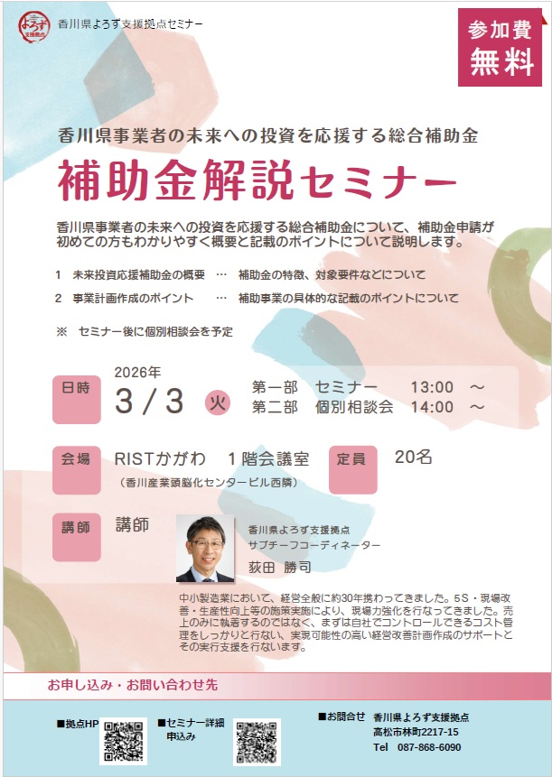 - 香川県内の中小企業・小規模事業者、また創業・起業を検討している方