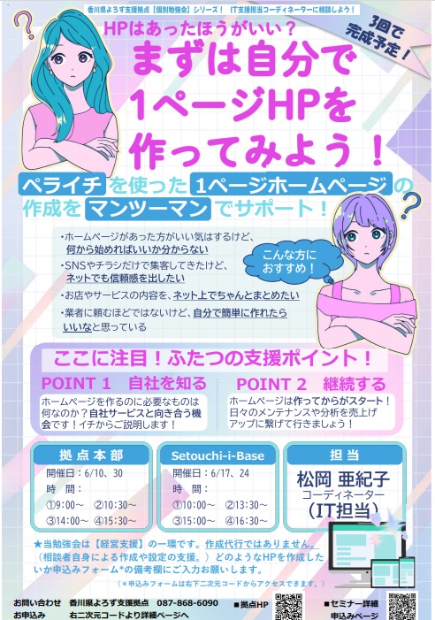 | 受付終了 | 8月12日(火) 09:00 | WEB関連・IT活用 | まずは自分で1ページHPを作ってみよう! |