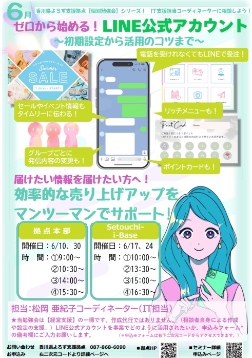| 受付終了 | 8月12日(火) 09:00 | WEB関連・IT活用 | ゼロから始める!LINE公式アカウント |