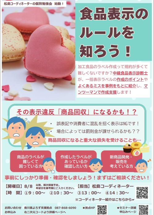 | 受付終了 | 8月8日(金) 09:00 | 販路開拓・商品開発 | 食品表示のルールを知ろう!(8月8、22、27、9月4、9、10、24、25) |