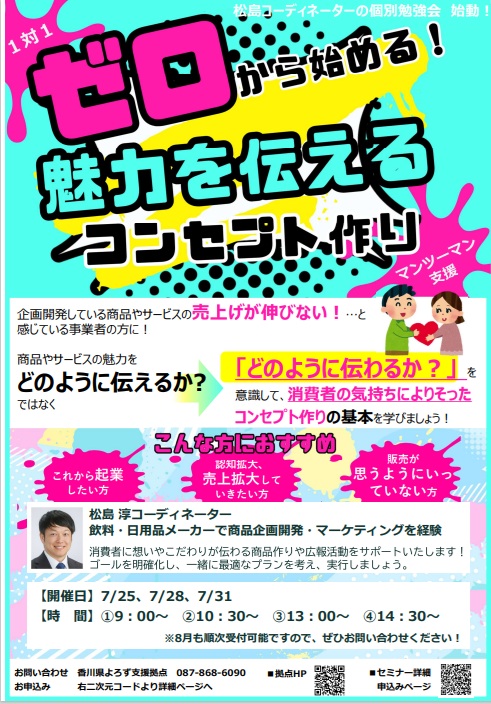 | 受付終了 | 7月25日(金) 09:00 | 販路開拓・商品開発 | ゼロから始める!魅力を伝えるコンセプト作り(7月25、28、31、8月7、8、22、27、9月4、9、10、24、25) |