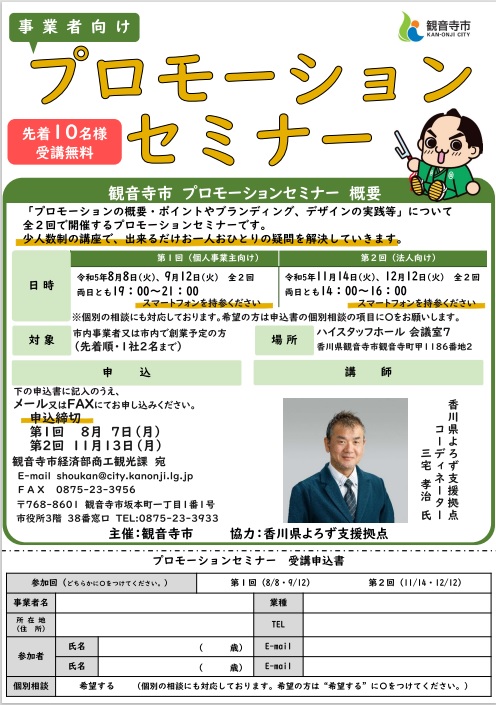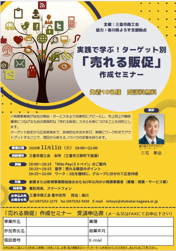 | 受付終了 | 11月11日(火) 18:00 | WEB関連・IT活用 | 実践で学ぶ!ターゲット別「売れる販促」作成セミナー |